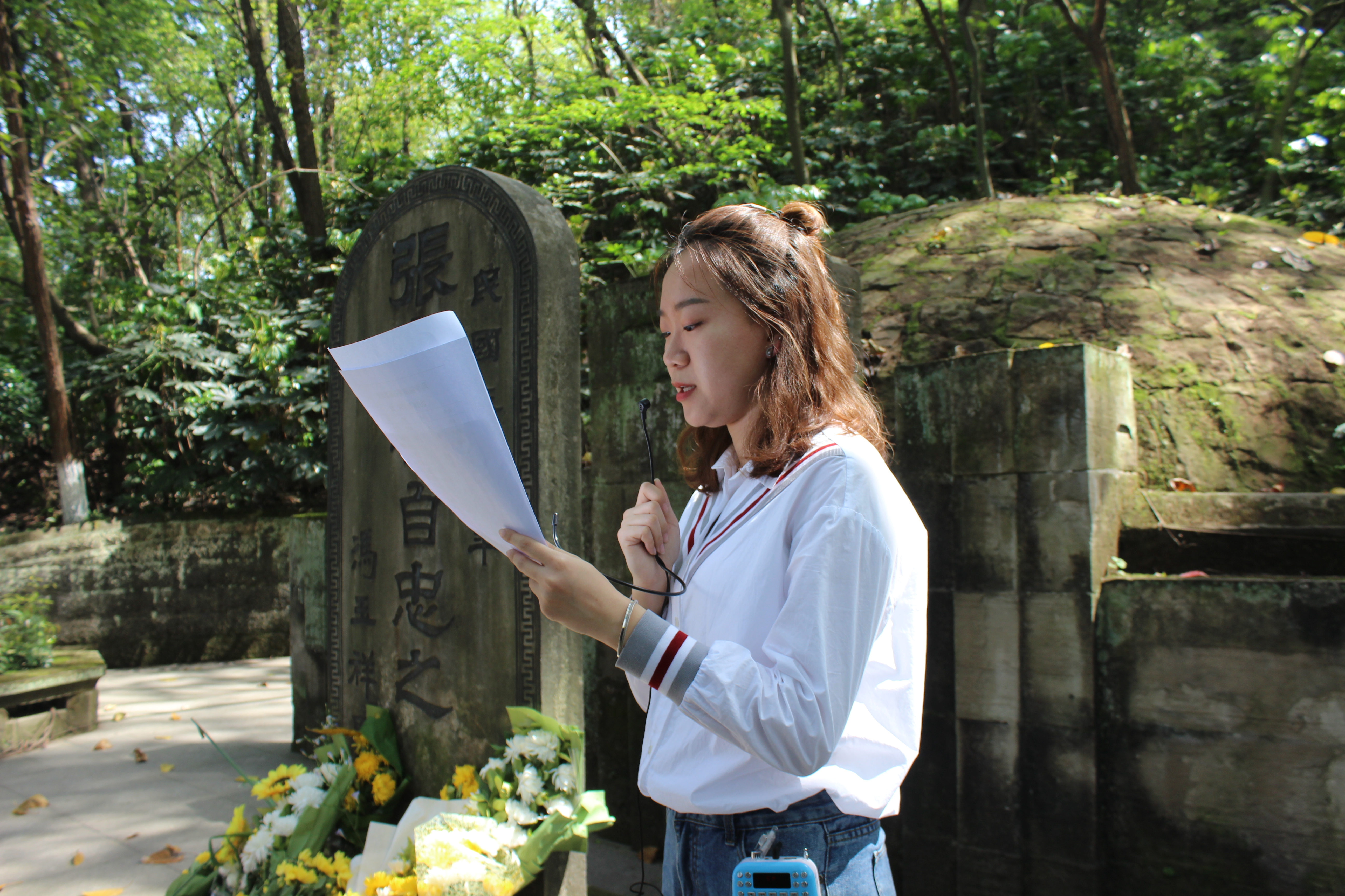 代表发完毕,接下来主席团及部长代表、各班代表先后上前献花,献花完毕,集体默哀一分钟以缅怀张烈士。