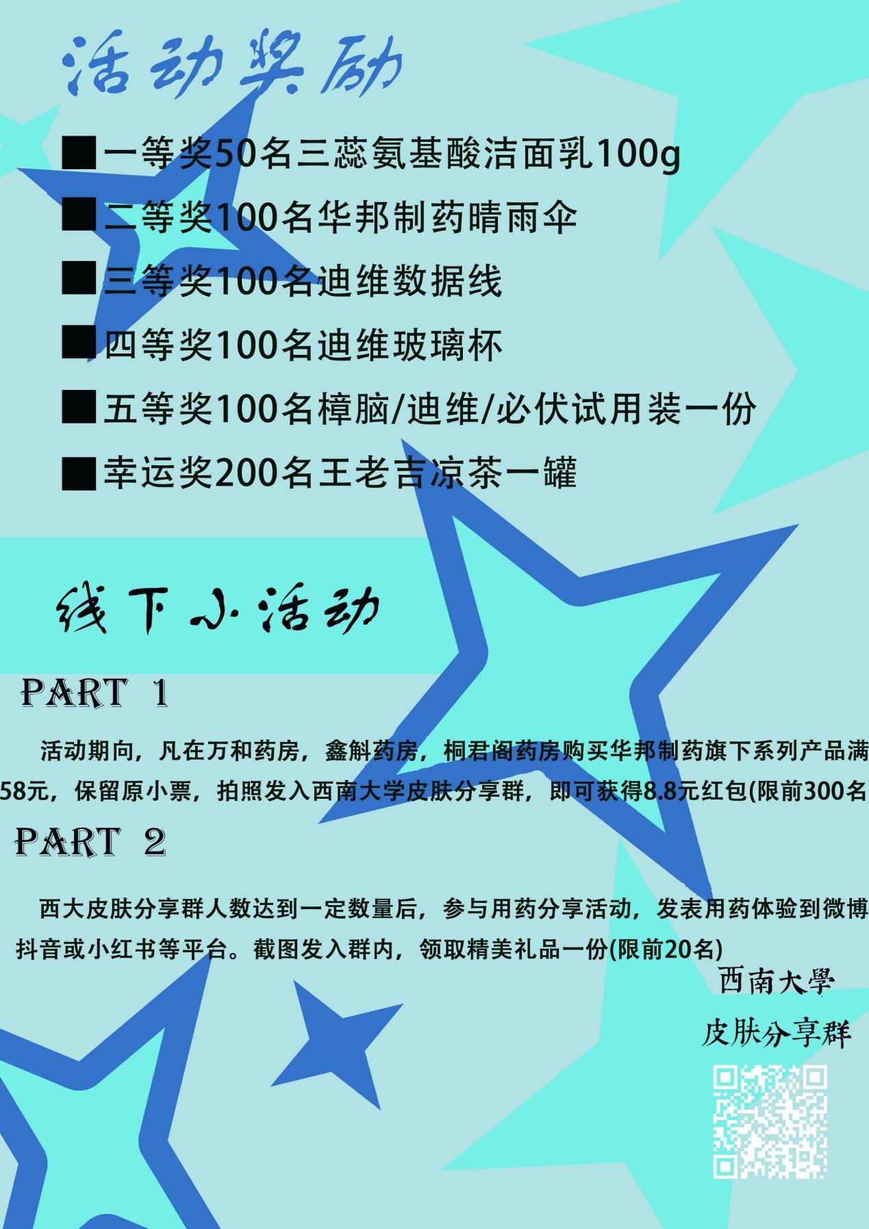 活动三:活动期间(10.21-11.30),凡在指定连锁药店(仅限万和药房、鑫斛药房、桐君阁药房)购买华邦制药产品超过58元且留有原始小票,拍照发至英国365上市公司皮肤分享群,即可在群内找相关工作人员领取8.8元现金红包。使用华邦制药产品后,在任一公众平台发布用药前后对比,截图发至群内相关工作人员处,还可领取精美礼品。