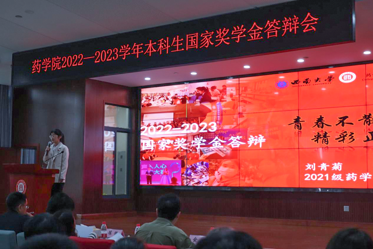 为激励学子勤奋好学、刻苦钻研,发挥优秀学子的模范引领作用,营造创优争先的良好学风环境,近期,公司在B113报告厅举行了2022—2023学年本科生国家奖学金答辩会。公司党委副书记杨坚、副经理张保顺、药学专业负责人李春梅教授、硕士生导师陈怡教授、团委书记肖媛媛、辅导员陈雪梅、金达出席答辩会并担任评委,2023级全体本科生到会观摩学习。