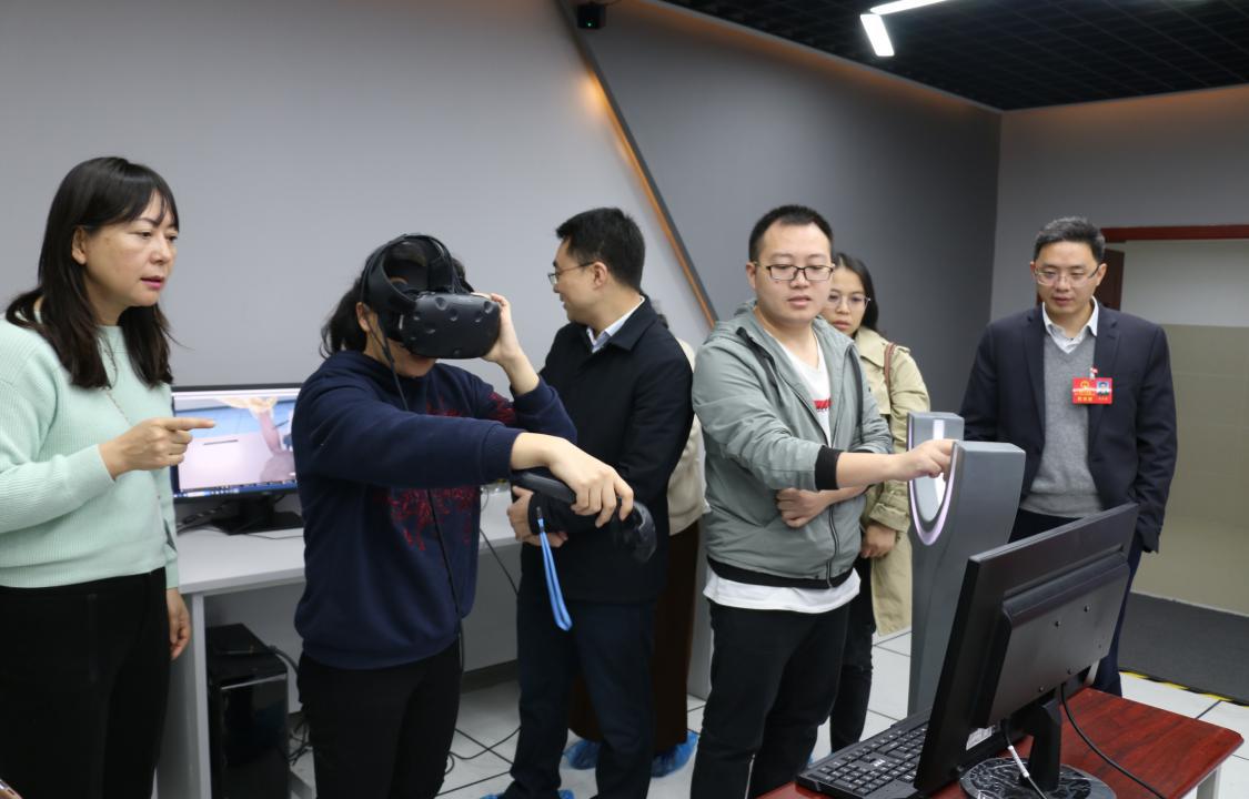 在前不久投入使用的虚拟仿真实验教学中心,代表们认真听取了李逐波教授对实验室建设、虚拟仿真设备的讲解,并体验感受了虚拟仿真设备在教学科研中的实际操作运用。