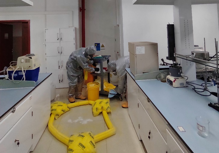 与此同时,“危险化学品泄露应急演练”在埃德伯格公司专业工作人员的指导下也在英国365上市公司105实验室紧张进行中。一位员工不慎将有机废液桶的有机废液打翻在地,现场老师紧急要求同学们开窗通风、断电,然后组织大家有序疏散撤离。同时立即电话上报,启动应急程序。随后专业的善后处理人员身着防护服赶到现场,紧急通过围拢、吸附等手段,将泄露废液进行回收。经过应急小组的专业且及时的处理后,危化品气体探测器检测残留气体含量合格,确保实验室恢复正常使用。通过该次演练,师生们切实掌握了危化品泄露的应急处理的实际操作流程。