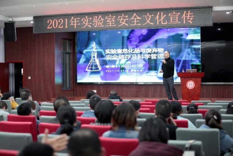 然后,杨勇董事长作了“实验室危险化学品与废弃物安全存储及科学管理”专题讲座。讲座主要包括实验室安全现状分析、典型事故案例、典型安全隐患、个人防护要求、安全废弃物管理等五个方面。此次讲座老师们对人为因素造成的安全事故感触深刻、收获满满。现场互动热烈,报告后老师们和杨总互留联系方式保持会后的进一步交流学习。