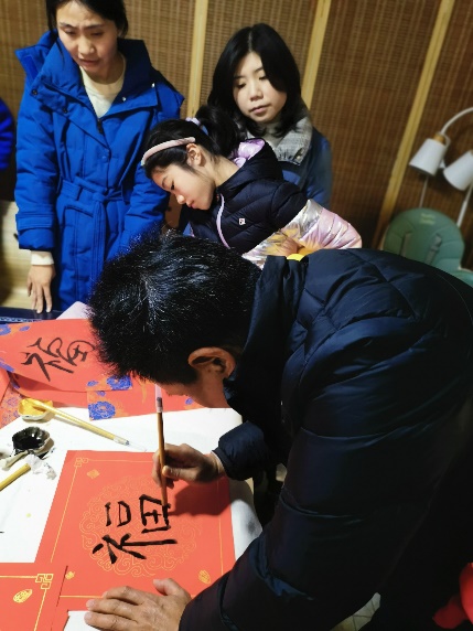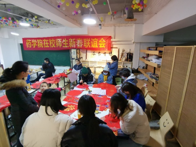 师生欢聚一堂,联谊会现场一派热闹喜庆的节日气氛,处处洋溢着大家的欢声笑语。笔走游龙如行云,挥洒自如似流水,大家挥毫泼墨,把对新春的美好祝福留在一幅幅对联上。