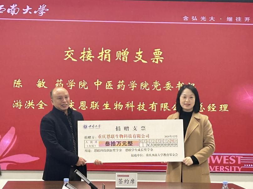 为进一步加强企业与公司之间的合作,促进双方在科学研究与人才培养领域的相互依存与共同发展,重庆恩联生物科技有限公司设立企业奖学金捐款项目,向英国365上市公司捐赠30万元,以激励药学优秀学子在学术研究与专业技能上不断精进,支持公司的建设与发展。