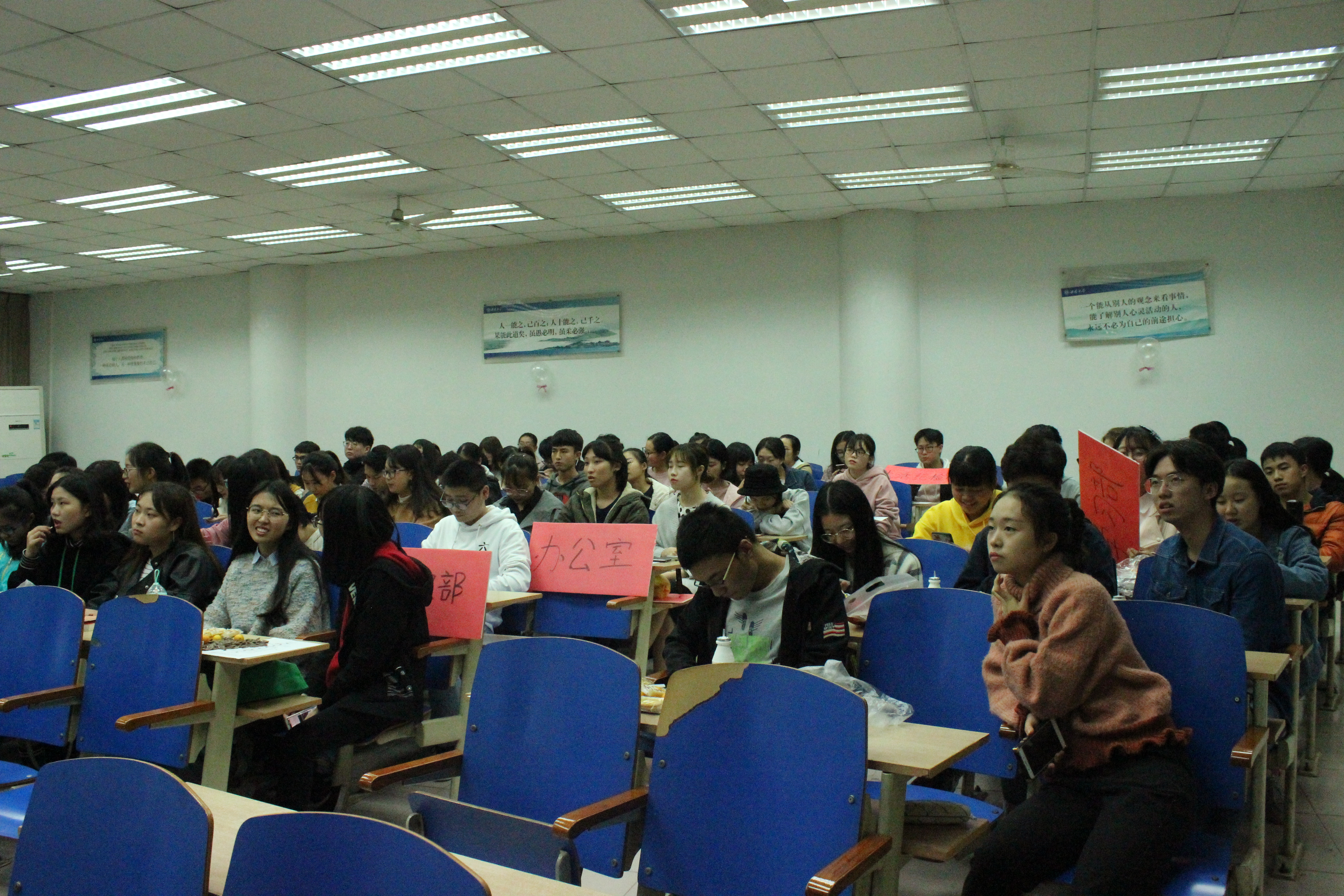 之后,各部门依次上台展示了部门风采。由部门内的一名干事介绍所有人员,介绍完毕后,部门现场表演或者播放事先精心准备的视频。现场气氛在表演中彻底地被带动起来,欢声笑语洋溢在整个513教室。
