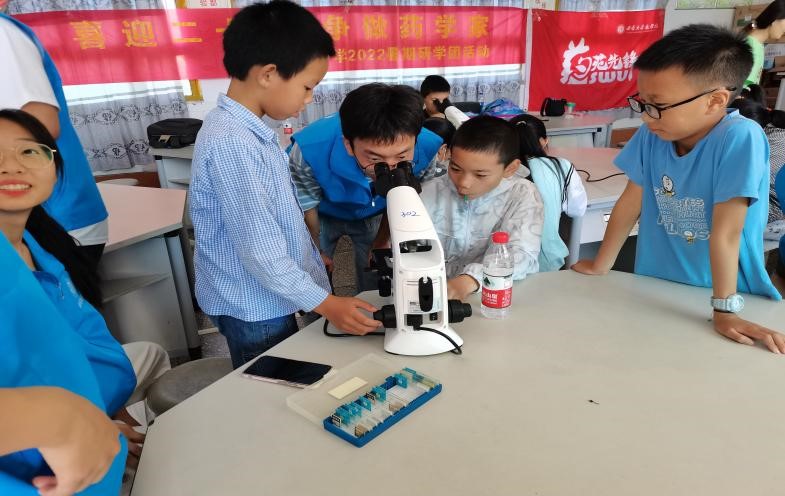 实践团成员带黄水小学员工使用显微镜