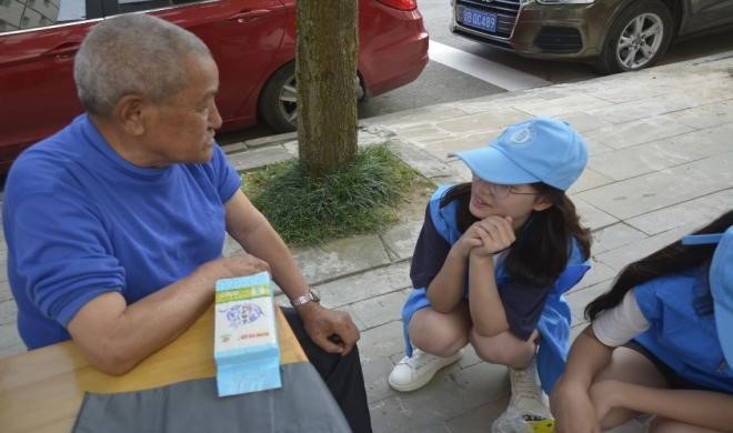 实践团成员与老人交流健康生活理念