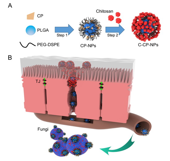 药物靶向递送是药物研究的一个重要领域,旨在提高药物在病灶部位的富集程度并减少其全身性分布,从而有望实现高效低毒的治疗。李翀教授课题组一直围绕多肽介导药物靶向递送开展工作。本研究中,基于壳聚糖既是部分病原微生物表面重要靶标,同时壳聚糖本身还是能促进口服吸收的功能辅料,该课题组设计了一种可经口服实现靶向抗感染的递送系统:将壳聚糖结合肽作为靶向分子修饰于载体表面,再与壳聚糖孵育后形成“核-壳”型载体,该载体在壳聚糖辅助下能有效通过口服吸收屏障进入血循环,同时壳聚糖发生脱落,暴露出靶向分子的载体得以实现在感染部位的有效蓄积。目前,静脉注射是靶向递药的主要实现方式,本研究为经口服这一安全性和顺应性更好方式实现药物靶向递送提供了重要思路。