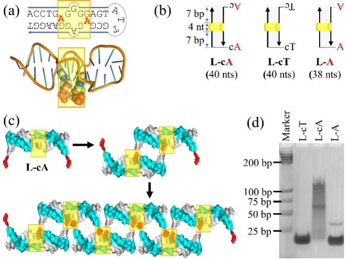 团队首先分析了AMP适配体的序列特征(图1a):黄色方框里面为结合口袋,红色部分为AMP,其中仅有腺嘌呤和脱氧核糖部分插入结合口袋中,磷酸骨架暴露在外,不与适配体作用。根据这些特点,设计了两条能形成双链且包含AMP适配体的DNA链,命名为L-cA(图1b)。两条链的末端都是碱基A,A和其他碱基之间用碱基C分隔,作为柔性的连接部分。由于AMP适配体具有两个腺嘌呤结合位点,L-cA的两个碱基A能够识别结合口袋,通过适配体-配体的作用自发地聚集形成线性多聚体(图1c)。