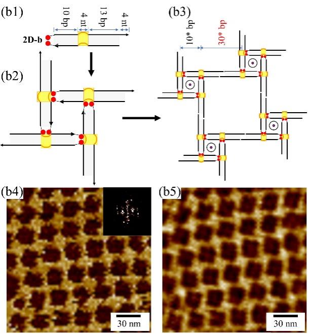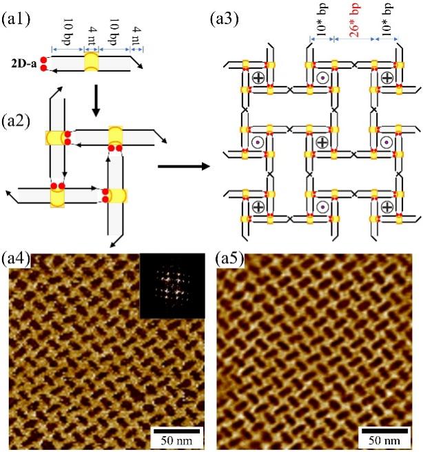 进一步研究表明,基于AMP适配体-配体结合作用可以编程DNA模块组装成规则的2D阵列结构。团队设计了两个类似的双链DNA模块(2D-a和2D-b)(图3a1, b1),每个双链DNA模块均包含:(1)一个AMP适配体结合口袋;(2)双链的左侧含有两个外延的碱基A;(3)双链的右侧含有4 nt的自互补的粘性末端。2D-a和2D-b均能通过二价适配体-配体作用以类似S-cA的方式组装成正方形结构(图3a2, b2),进而通过粘性末端作用进一步组装形成规则的2D阵列(图3a3, b3)。原子力显微镜成像清晰地展现了2D阵列的形成和规则排列(图3a4, a5, b4, b5)。