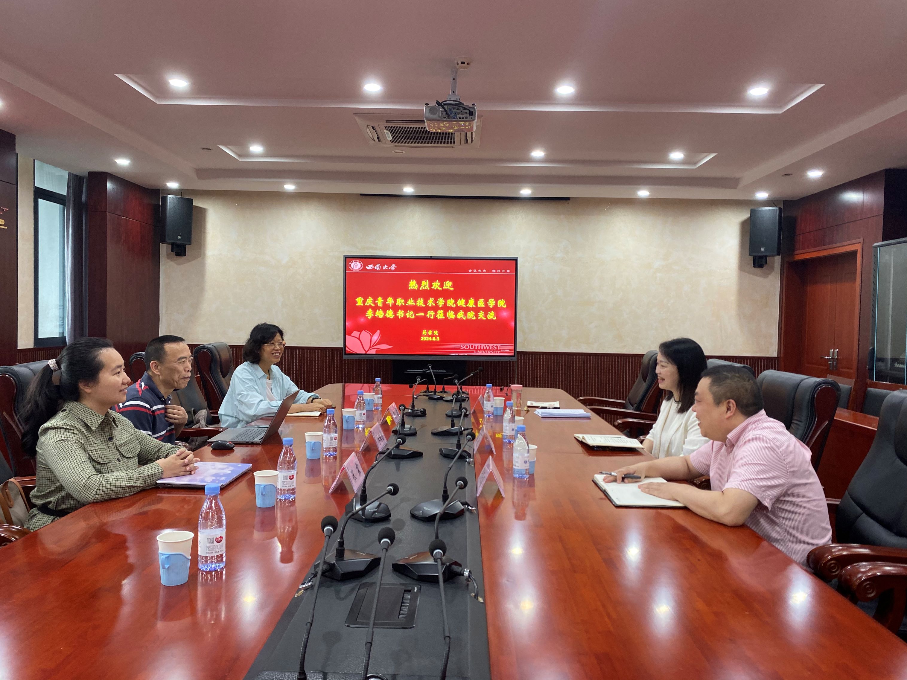 6月3日,重庆青年职业技术公司健康医公司李培德书记、冉波经理一行莅临公司考察交流,就将来在团队力量培养、人才队伍建设、教学质量提升、科学研究合作和社会服务推广等方面进行深入探讨。公司党委书记陈敏教授、教学副经理张保顺教授和教学办程丹参加座谈。此次会议旨在加强两院全面合作,帮扶和助推重庆青年职业技术公司健康医公司在教学和科研上高质量发展。